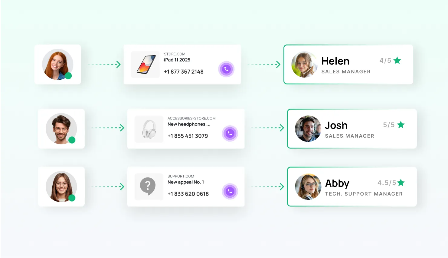 Website visitors see phone numbers with familiar local codes depending on their city or country. This removes barriers — clients are more likely to call a number that feels “their own,” without doubts about tariffs or trust issues.